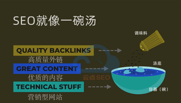 有很多因素会影响SEO的效果,但Google的搜索算法是绝密,我们无从得知其中包含了哪些具体的因素及其运算规则,仅仅外界推测出的排名因素就有200多项。云点SEO根据多年实操经验,归纳出了三个方面。为了更加简单地理解这三个方面,你可以把SEO想象成一碗汤: