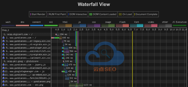 测试的时候,你可以自由选择测试地区。如果是外贸网站的话,一般可以选择美国地区进行测试,也是默认的选项。如果是针对国内的网站,那自然需要选择中国比较好。也就是说,测试的地区选择为你的目标用户所在的地区,毕竟网站是给他们访问的。这款工具不仅能够检查到实际加载速度,更加详细的资源加载耗时也有对应的检测报告: